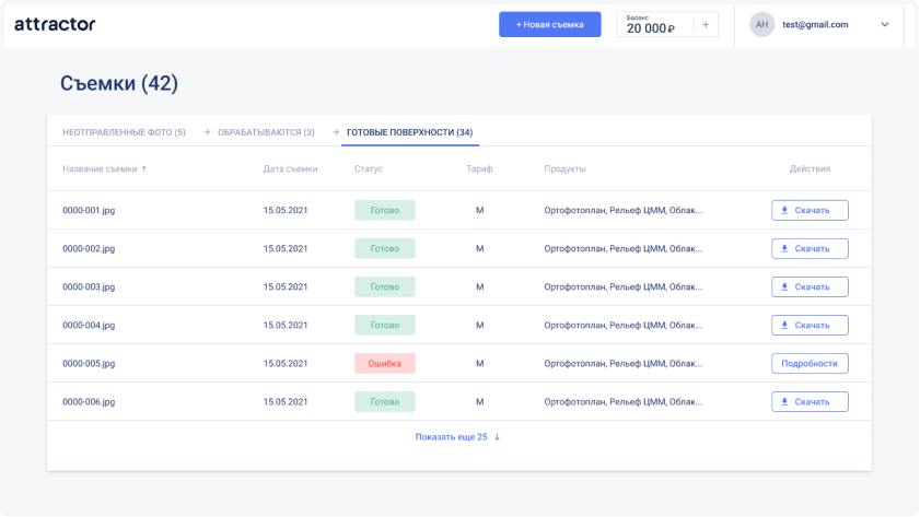 Upload up to 10,000 images without special software. Attractor converts photos into digital models of your object. Processing of most surveys takes up to 1 hour, after which the output will be online and available for download in your account.